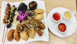 “泰國小食拼盤”我們點了細份量的, 一共有六款小食( 炸蝦餅、炸魚餅、香葉包雞、 泰式素春卷、牛肉串燒、豬肉串燒),還搭配三款醬汁( 蜜糖、泰式辣醬、沙爹醬)炸魚餅及炸蝦餅超級彈牙,而且新鮮炸出熱辣辣的,加上點泰式辣醬更好味!