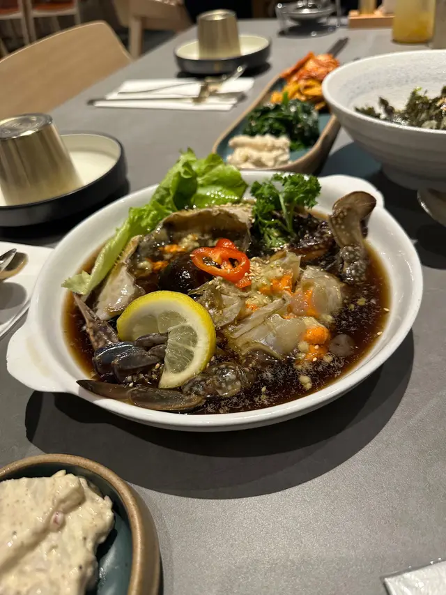 🔸️高級韓國生拌牛肉150g ($258)一見生牛肉就不得不點,在韓國吃過一次翻尋味,在香港則不常見亦怕質素。牛肉鮮甜嫩滑,當在口腔中慢慢嘴嚼時,與蛋黃及配醬混合的味道擴散開來,有香料的滋味,以及蒜味,甜辣甜辣的。夾著清爽雪梨吃,平衡拌牛肉的濃味,又是另一番滋味。🔸️醬油蟹 ($268)醬油蟹又是另一道需要衞生考量的,但聽朋友的推薦,對這兒有信心!醬油蟹肥美多膏,在蟹蓋拌海苔和白飯,真是名副其實的白飯小偷。與韓國吃到的不同的是蟹蓋內有三文魚,醬油亦比在韓國吃過的更濃味。🔸️燉牛排骨湯配飯 ($158)有專人剝肉,牛肉嫩,骨肉十分容易分離。意外人蔘粗大,比平常包裝蔘雞湯大數倍。湯充份表現出材料的精華,行氣暖胃,適合冬天,亦適合長輩補身,配上泡菜更再昇華到另一層次。另外付上了小杯人蔘酒,單獨飲十分濃烈,但放入湯中意外融合,增進活血功用。環境:原來在韓式食品超市內,容易走過錯過。餐廳內很多韓國人,絕對有質素保證。服務:能感受到員工的熱情,如果點燒肉都會幫忙烤,客人坐著等就可以了。同場見到有人慶祝生日,員工盡心打點,使命必達。✴總結:一秒帶回韓國的回憶,優質服務。…查看更多
