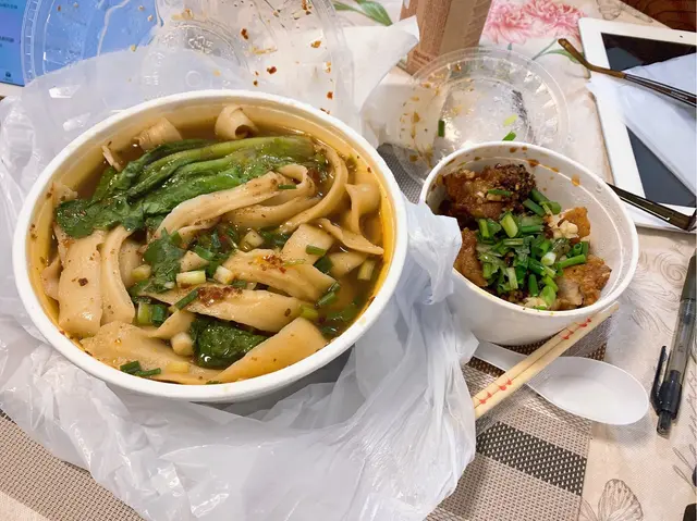 好少黎新北江食飯,但係因為厭倦左食大集團,所以呢陣子都去左新北江揾食揸住揾食APP揾左樂湖刀削麵,老實說自從以前食過唔好食既刀削麵後對呢個麵食都避之則吉,如果唔係見到網上有人推薦呢間店我諗都唔會俾多機會刀削麵今日叫既外賣係麻辣雞扒(少辣)、刀削麵(少辣)配豆漿呢間舖頭等外賣係要有少少等待時間,儘管NON-PEAK HOUR都要等十分鐘UP的未食都要先讚一讚,就係餸既辣度同麵既辣度都可以自選,即係可以㨂餸唔辣麵辣不過我以前試過叫麵唔辣,個人認為唔辣個味有點齋,叫返少辣會惹味很多麻辣雞扒有生蒜、蔥、荽茜(很香!)、雞扒切成一舊舊,炸得好香,配以辣油令人食指大動啊!刀削麵附以兩條生菜、蔥花刀削麵粗幼適中,唔會好似食麵粉一大舊咁,麵煮得軟,唔會咬到嘴仔攰。麵既長度大致一樣,唔會有D好長有D好短最重要係麵量十分多,我從未試過可以KO一碗麵,次次都食剩⋯⋯巴打果然有好推介