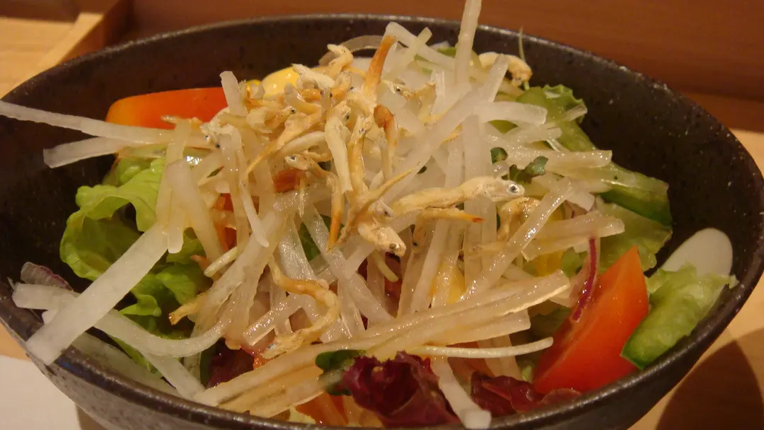 「大根沙律」。晶瑩剔透的清脆大根,搭配不知名、極香極富口感的小魚亁,與帶點醋味的醬汁搭配極為開胃。