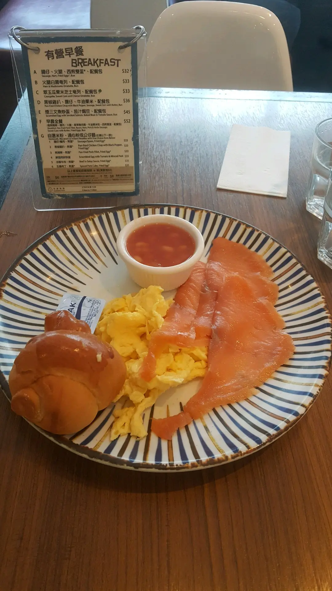 煙三文魚 炒蛋配 餐包 茄汁豆