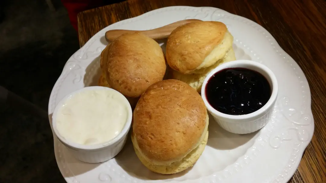 scone with cream butter and jam