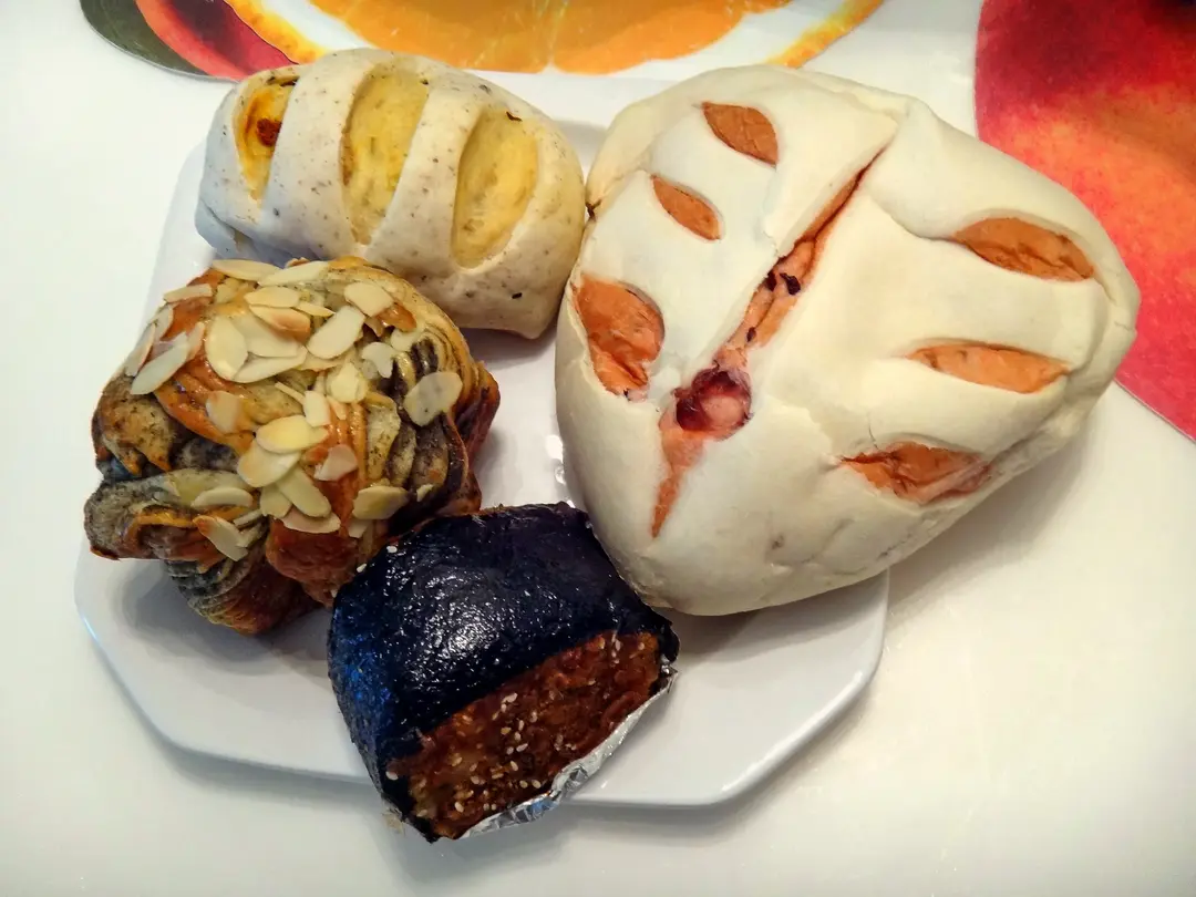 上左起順時針:養生歐克、玫瑰花洛神花乳酪包、紫菜肉鬆包、黑麻花