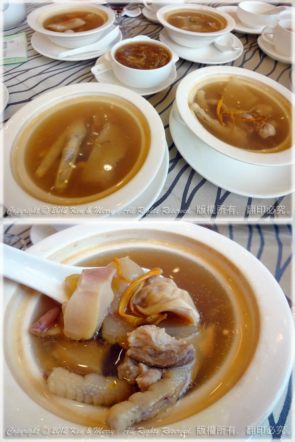 (上) 海參竹笙燴素翅 (下) 蟲草花螺頭花膠湯