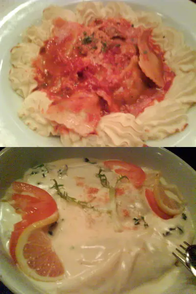 (上)芝士焗意大利雲吞伴薯茸;(下)芝士焗蟹肉菠菜卷