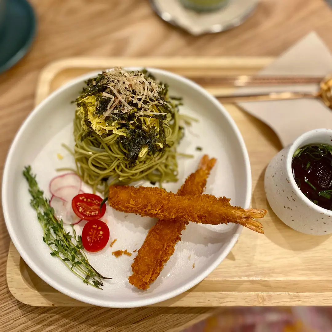 Matcha Cold Soba with Fried Prawns