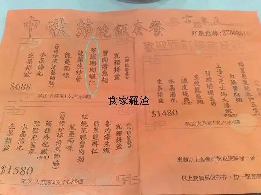 中秋套餐牌. 相對圖1,是明顯地多了一道炒蝦仁(藍圈).