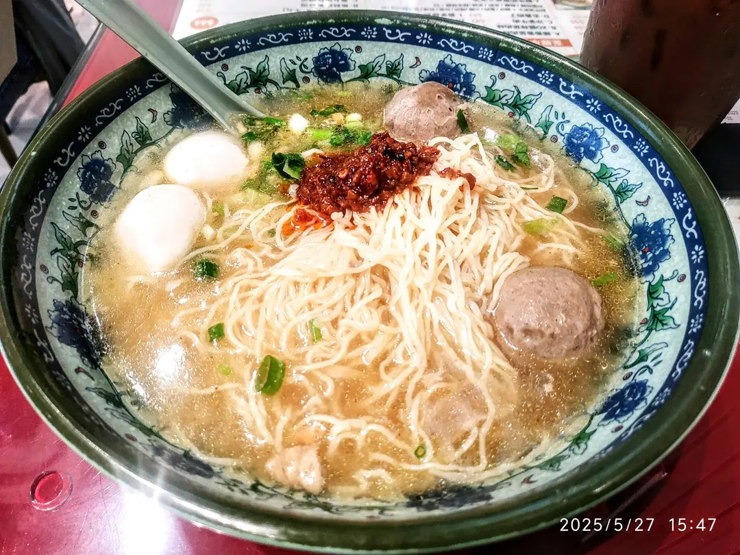 下午茶餐~雙丸(魚蛋、牛丸)幼麵加辣椒油跟凍鴛鴦