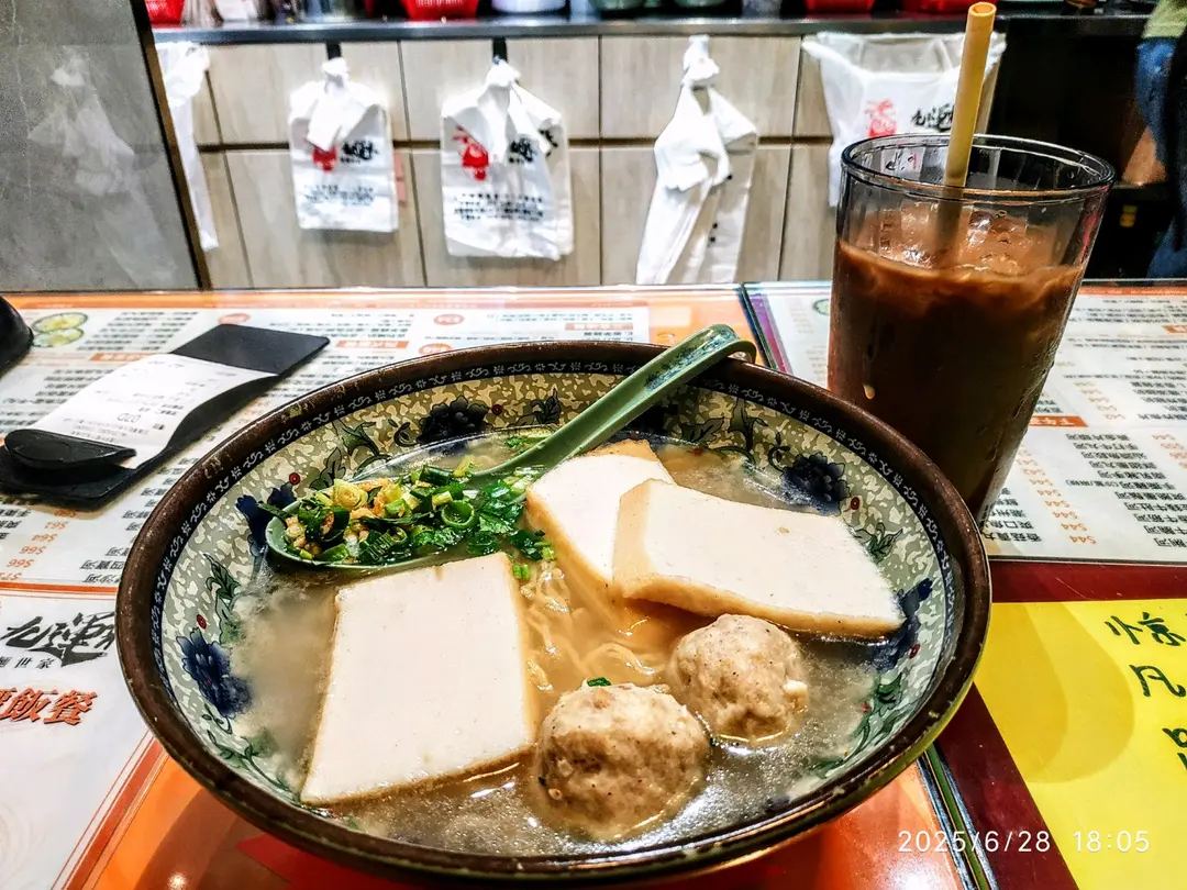 下午茶餐~豬肚丸拼魚片幼麵跟凍咖啡