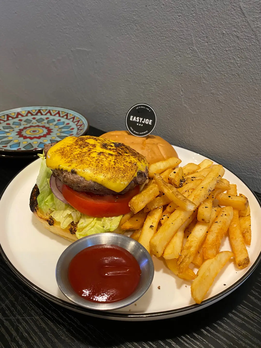 經典芝士洋蔥牛肉漢堡配粗薯條