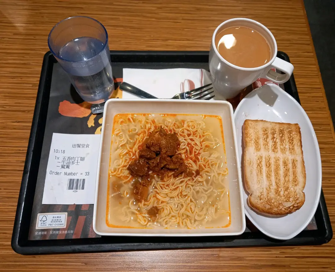 五香肉丁麵,牛油多士+咖啡