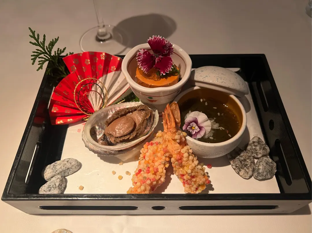 鮟鯠魚肝、磯煮鮑魚、松葉蟹水雲海藻醋、唐揚車海老