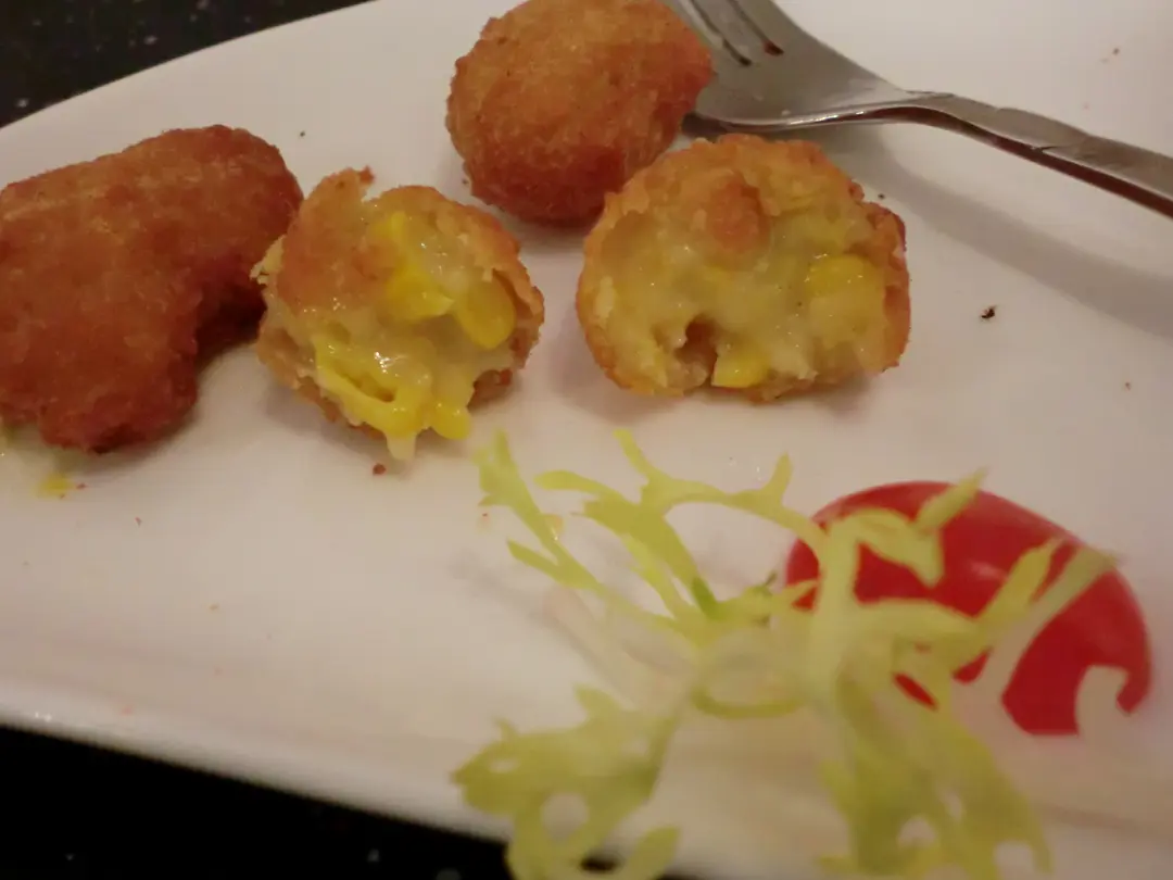 以粟米粒及粟米打成蓉,炸成球狀