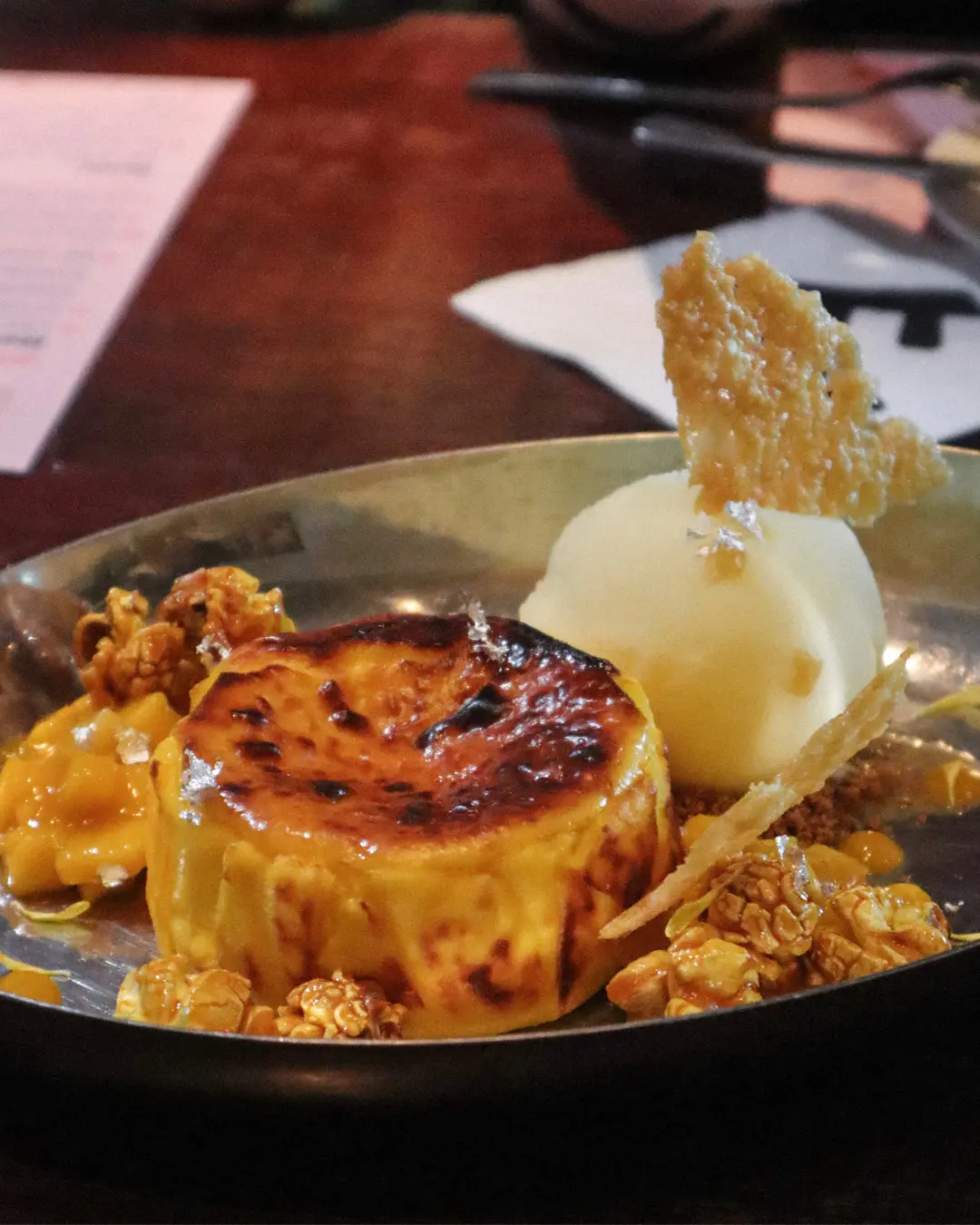 香濃粟米巴斯克芝士蛋糕,辣椒仔潰芒果粒,日本柚子雪酪,焦糖爆谷
