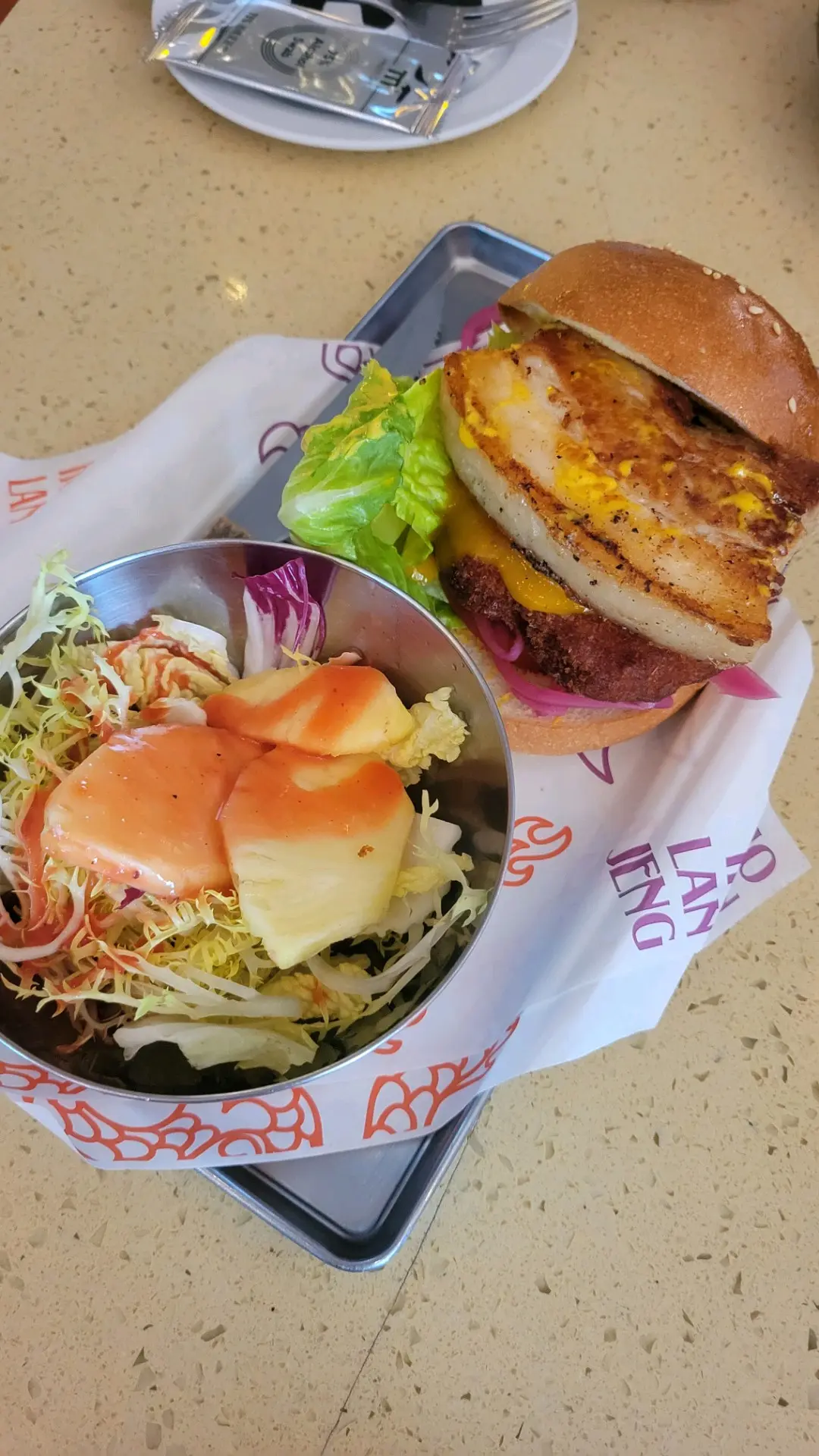 2. 漢堡包,五花腩,芒果咖喱醬,Q彈花枝醬,是日沙律