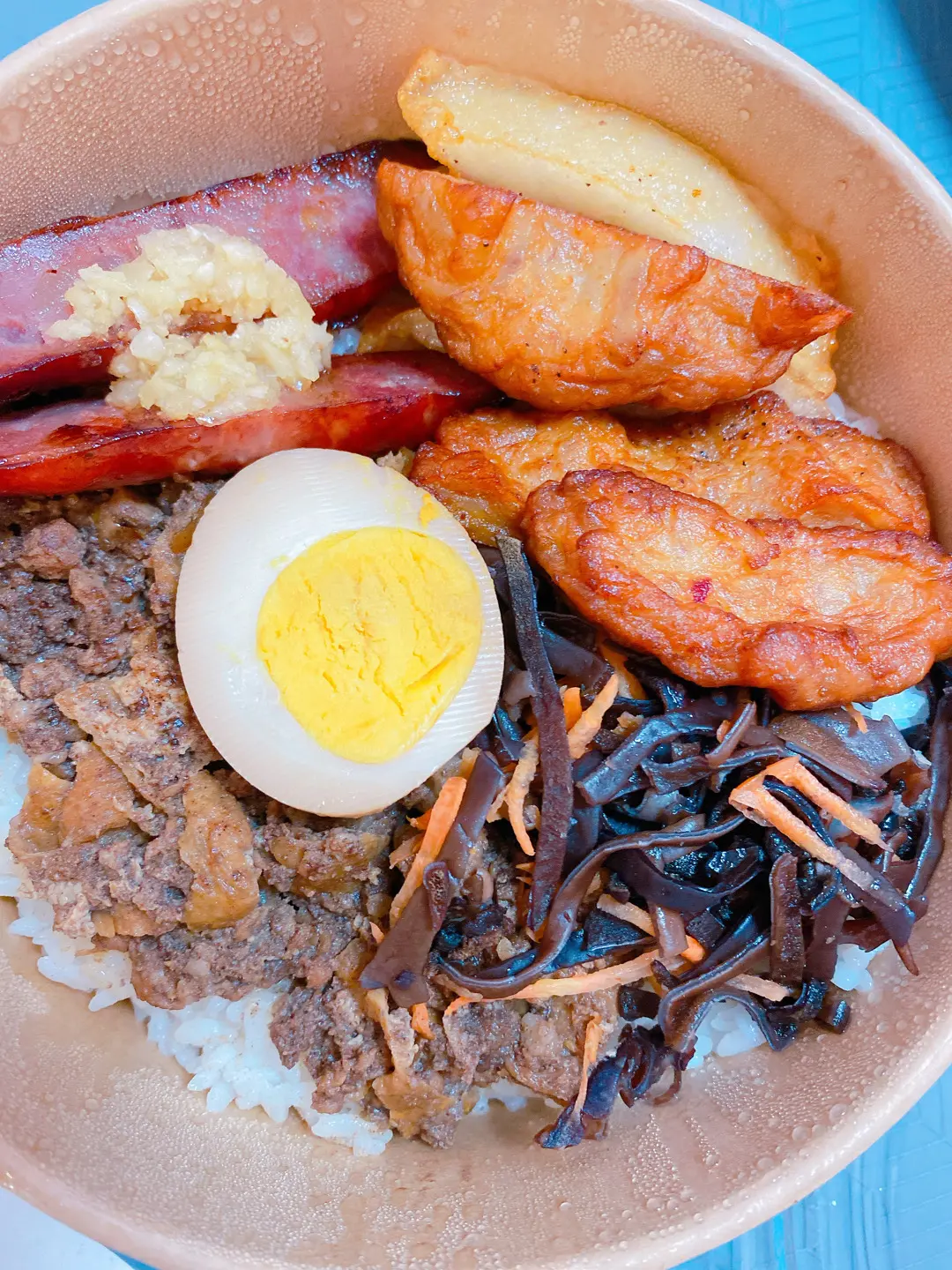夜巿鹽酥拼盤便當(台灣香腸,芋頭海鮮餅,甜不辣,滷蛋,精選配菜)