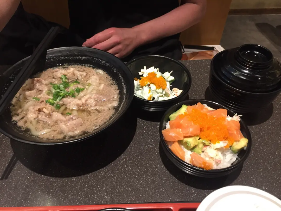 牛肉烏冬配三文魚蟹肉飯