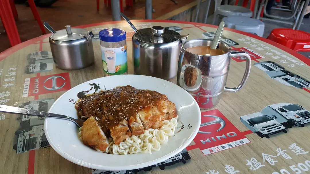 雞扒撈公仔麵,熱奶茶