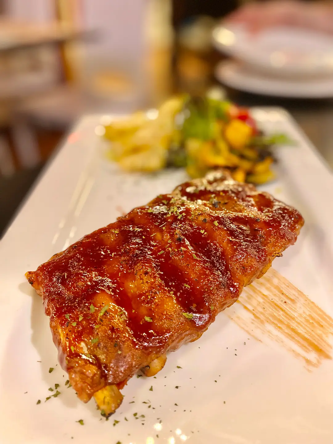 燒美國豬肋骨配燒烤汁伴蒜蓉香草醬薯角