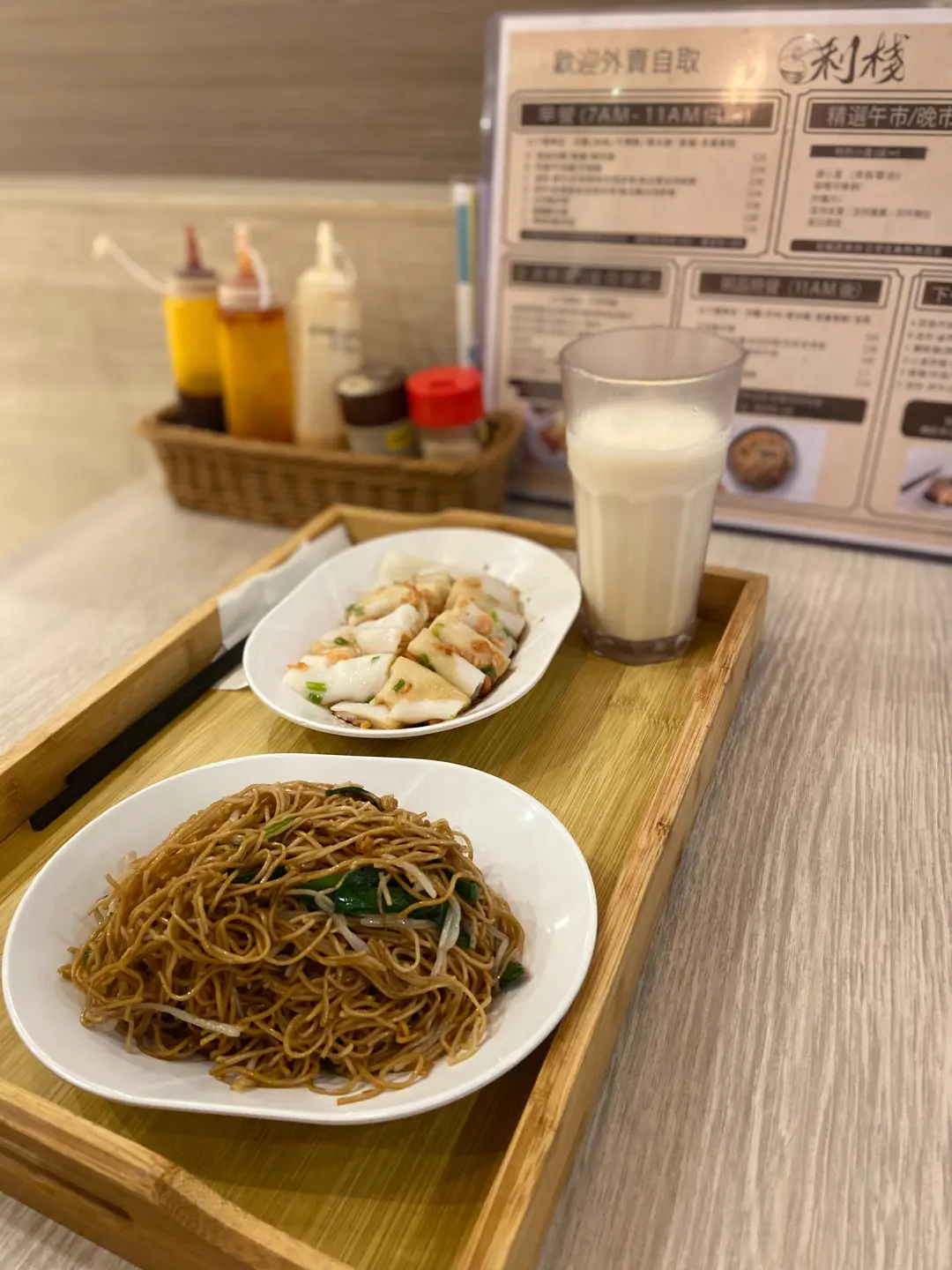 早餐(蝦米腸,炒麵,凍豆漿)