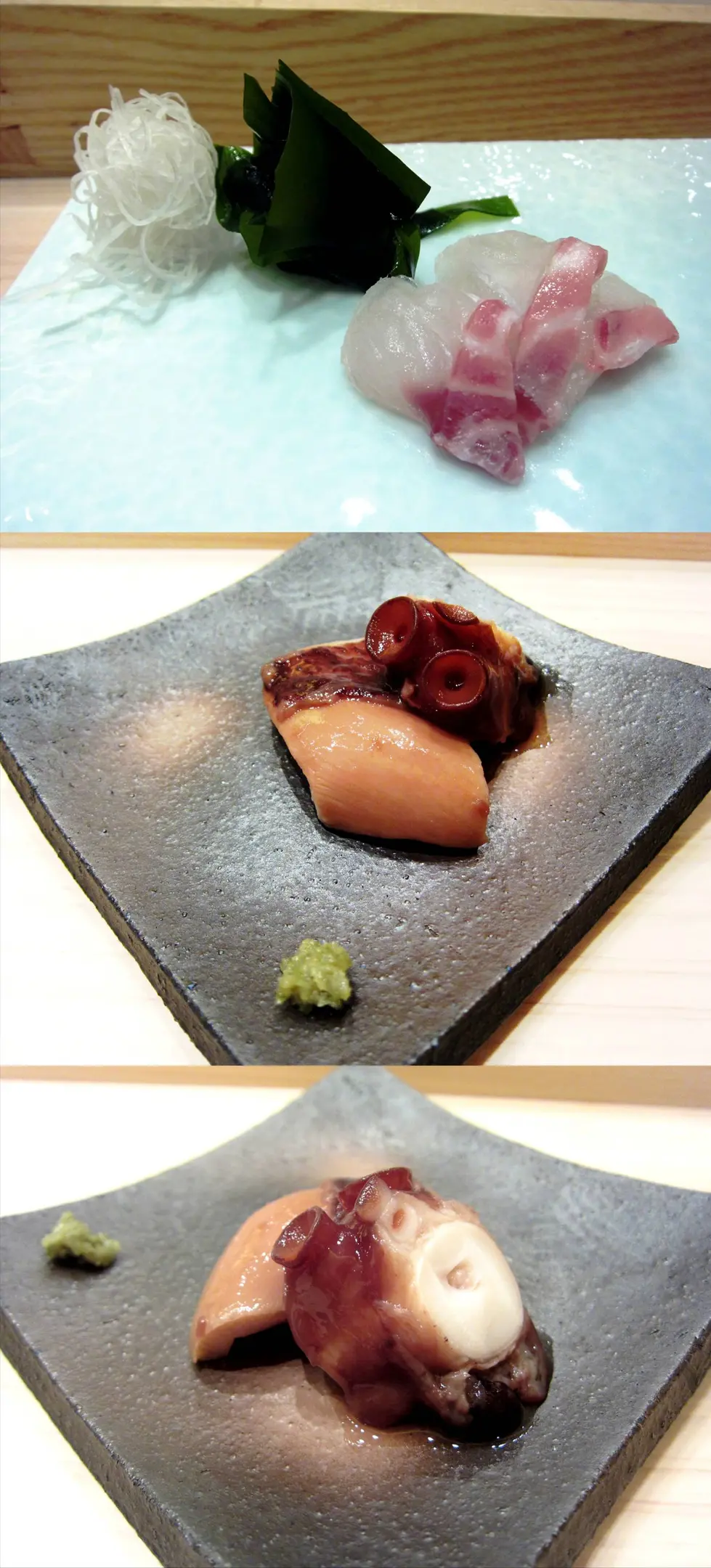 刺身1) 天然鯛の刺身 2)北海道水たこ煮 Tako was soft and succulent