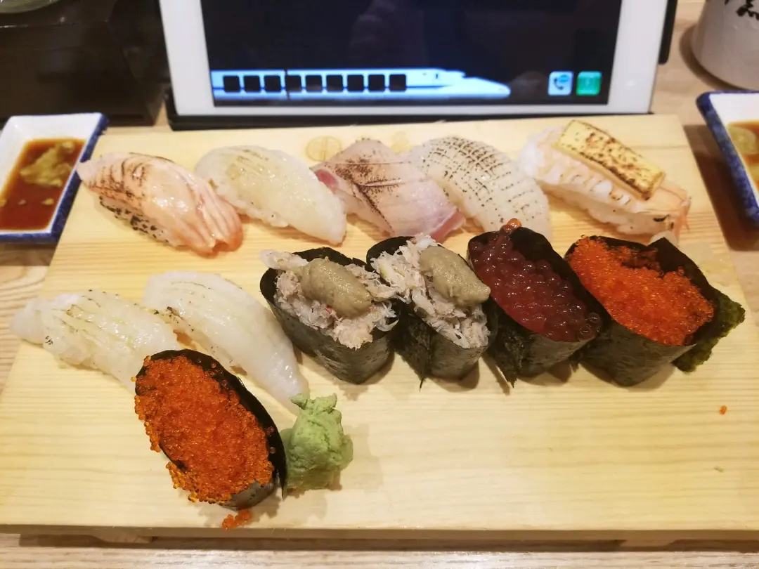 火炙壽司拼盤(5件)+火炙左口魚邊壽司+蟹膏軍艦+三文魚子軍艦+飛魚子軍艦