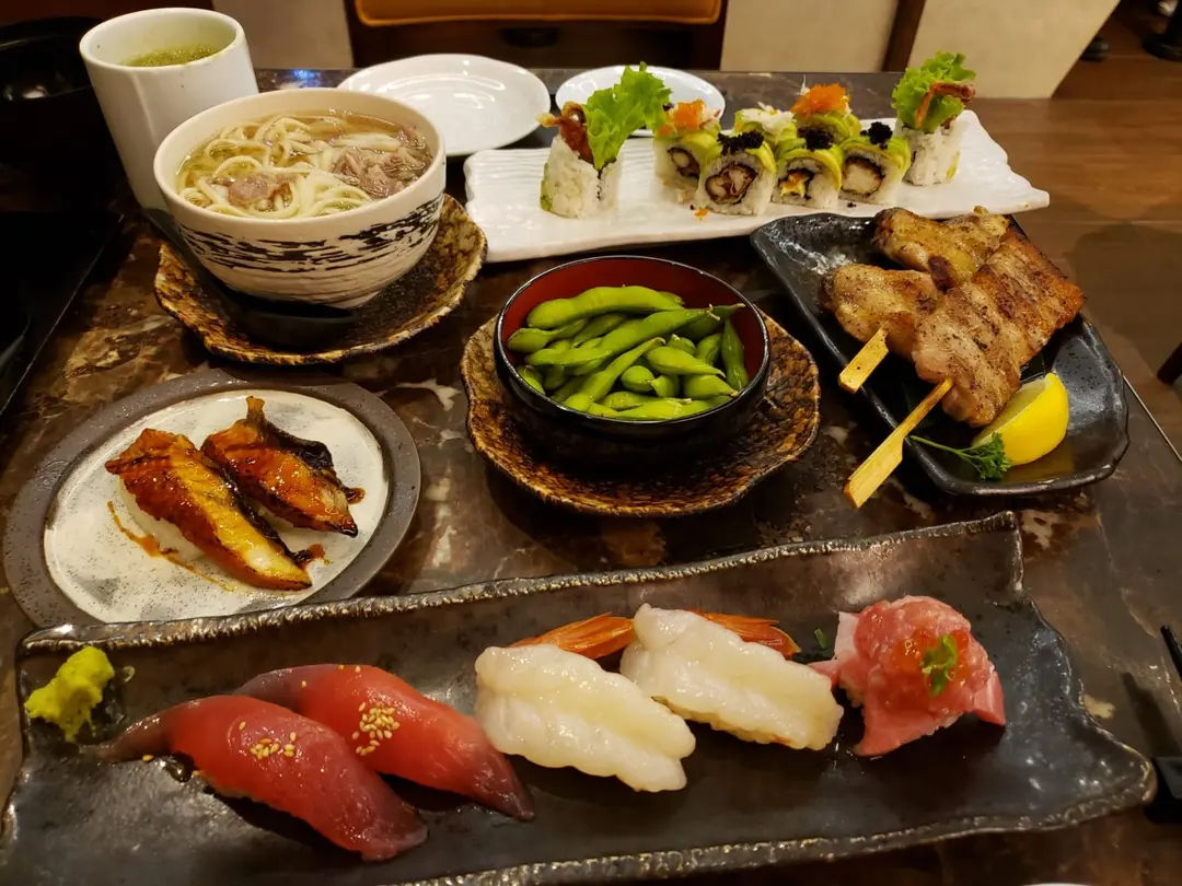 枝豆, 串燒雞翼, 串燒豚肉、珍寶赤海蝦壽司、大拖羅鹽谷吞拿魚蓉、吞拿魚醬油漬壽司、牛肉冰見烏冬、炙燒鰻魚壽司和牛油果軟殼蟹卷