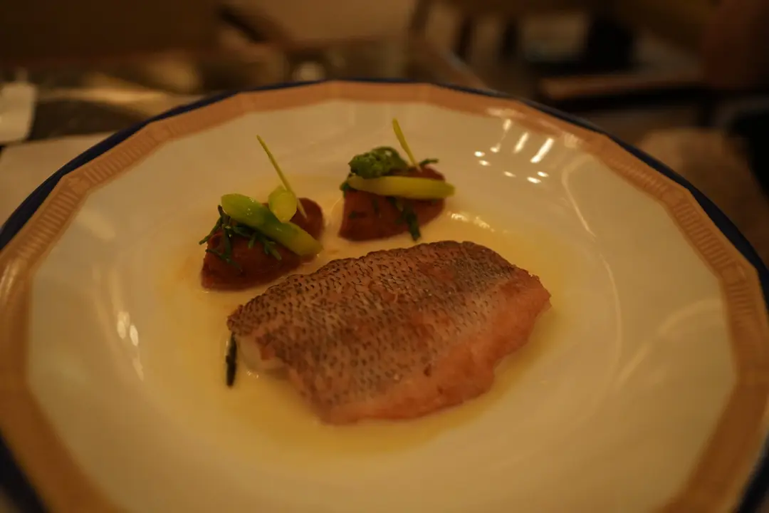 黃鱸魚配茄子蓉、青蘆筍、海菜豆、茴香酒汁