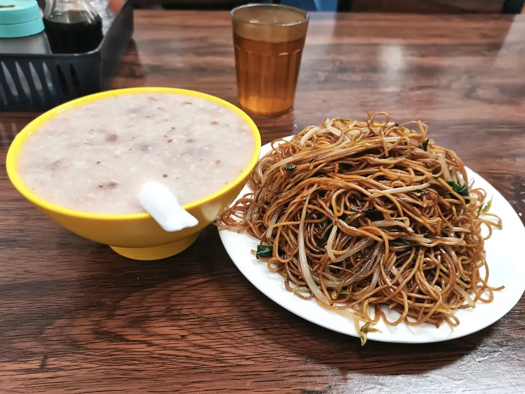 柴魚花生粥拼芽菜炒幼麵