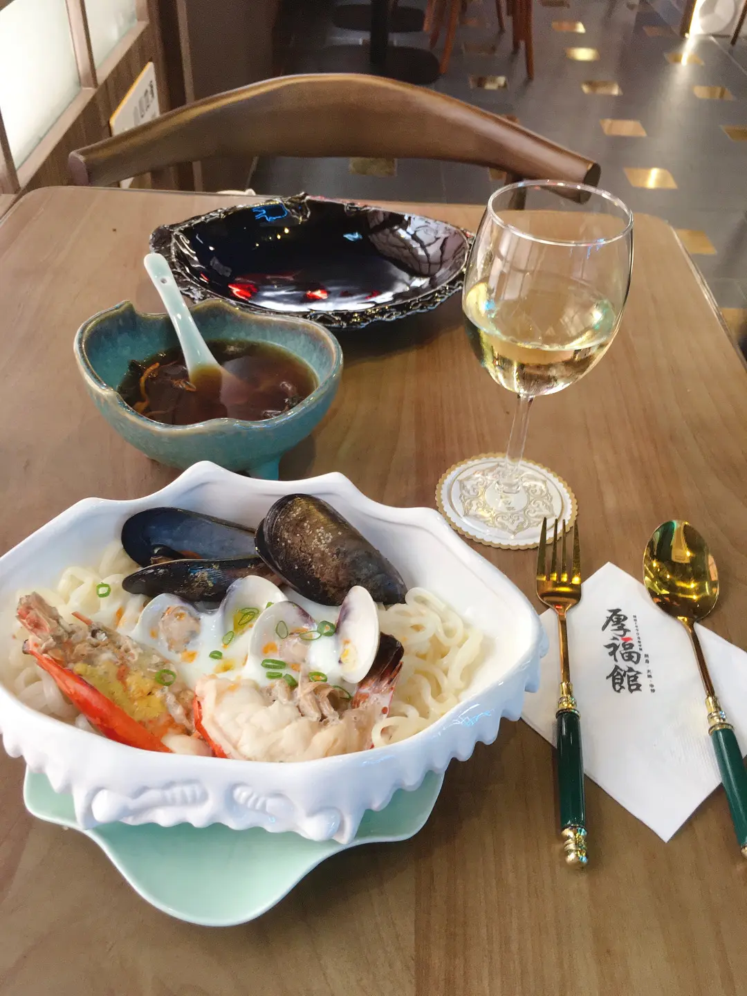 🦞雞油花雕蛋白蒸大頭蝦海鮮伴烏冬🦞