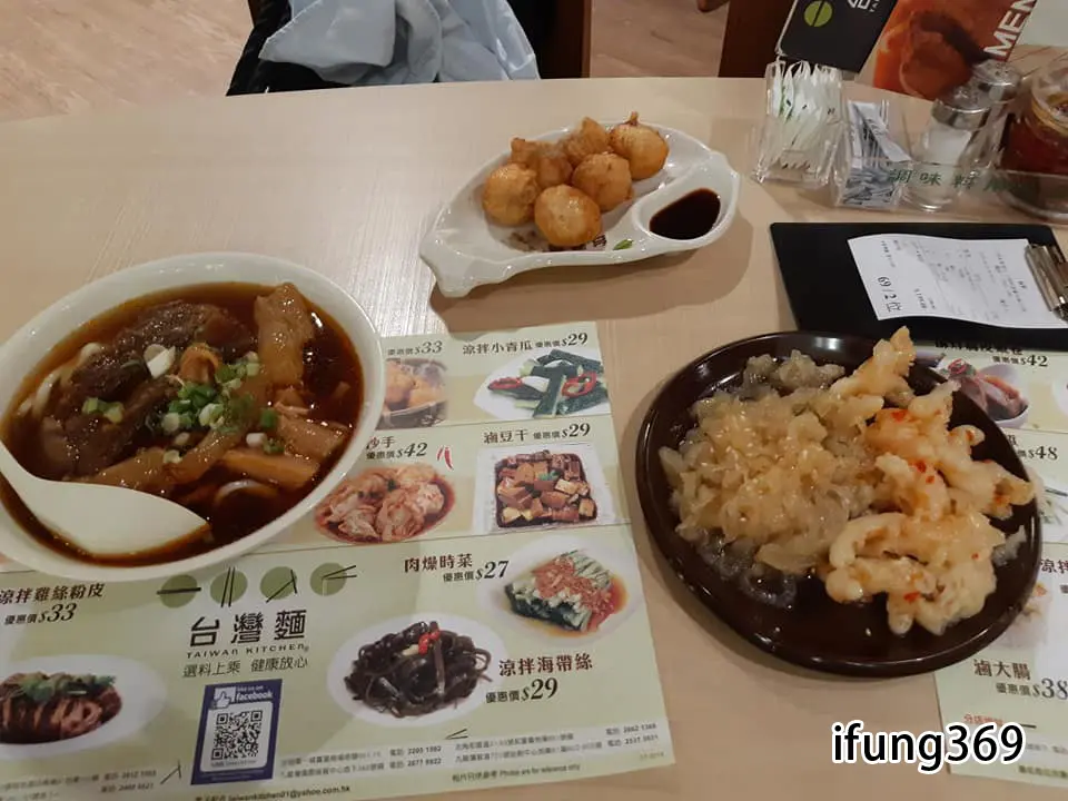 紅燒牛筋粗麵,鳳爪拌海蜇,酥炸花枝丸