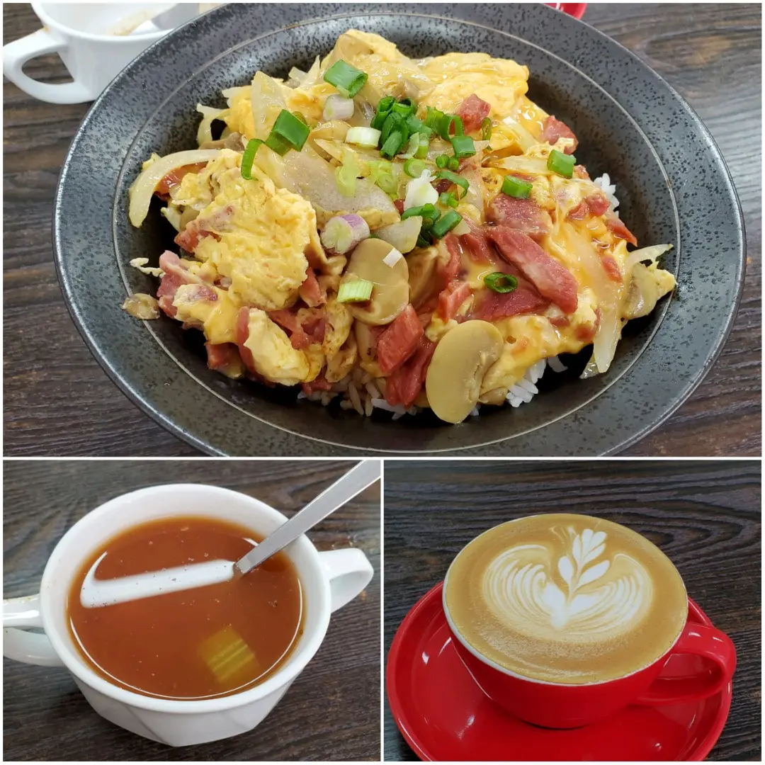 叉燒洋蔥炒滑蛋丼飯餐 加 latte