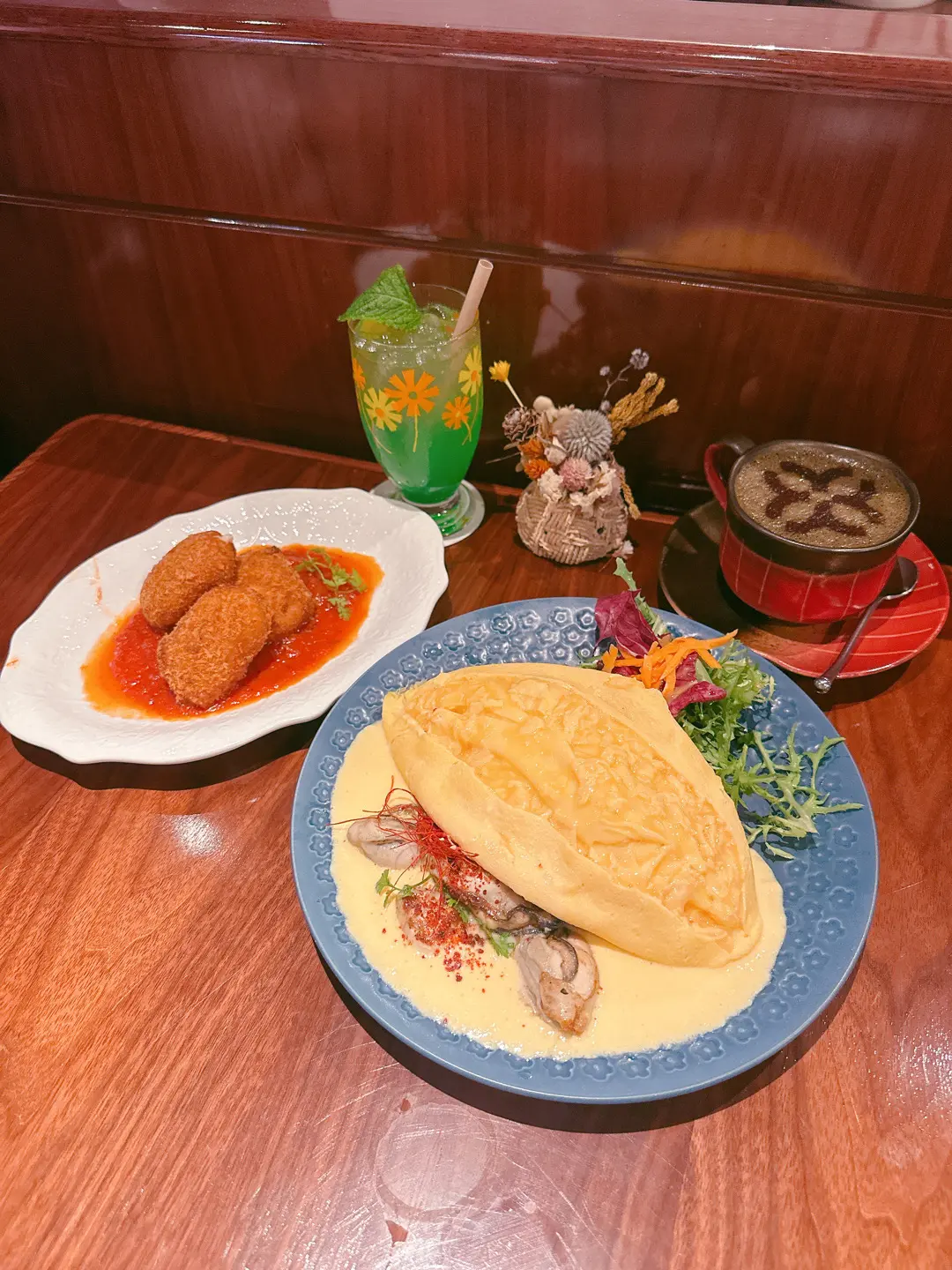🍤蟹肉忌廉可樂餅 🥚廣島蠔蛋包飯 🍹青空梳打 🍵焙茶牛乳