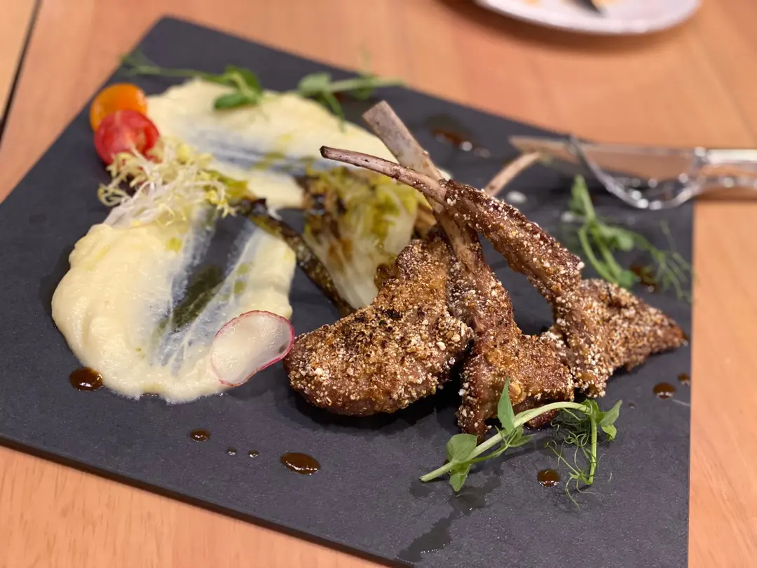 爆谷寶雲酥羊架,娃娃菜,開心果,鹹蛋黃醬,燒汁,薯蓉