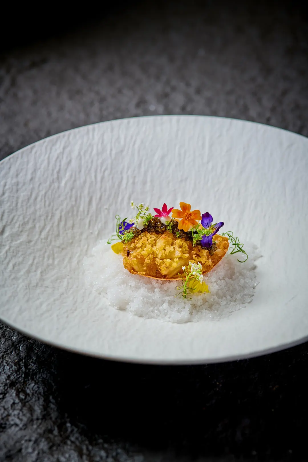 焗蟹粉蟹蓋配法國魚子醬及柚子醬