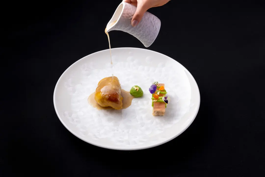 鵝肝釀鹽焗雞腿、浙醋雞清湯啫喱沙薑雞凍及青豆蓉