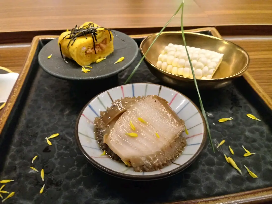 磯煮鮑魚、白粟米、魚鬆蛋卷