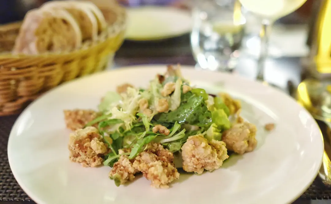 酥炸牛仔胸腺配薯蓉丶嫩菜苗及合桃沙律