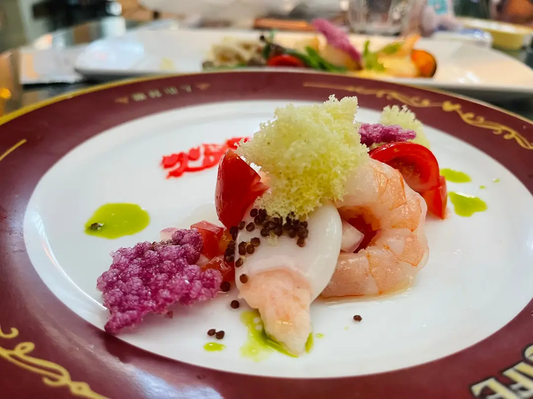 香煎鮮蝦、蒸魷魚卷 配芒果莎莎