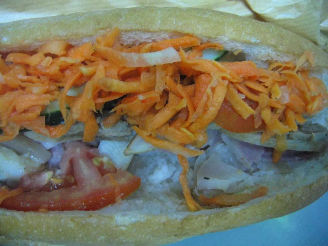 大量浸過甜酸醋的紅蘿蔔絲中和肉帶來的油膩感