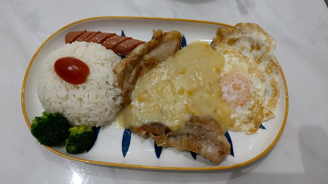 白汁粟米豬扒拼腸仔蛋