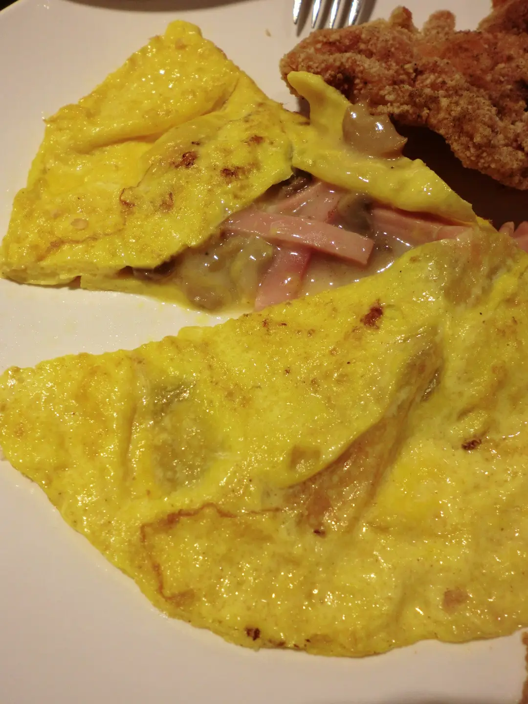 奄列有不少火腿絲、以白汁炒過洋蔥絲、蘑菇片