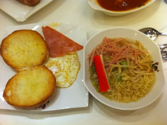 奶油豬仔包+火腿蛋、鮑魚絲蟹柳公仔面