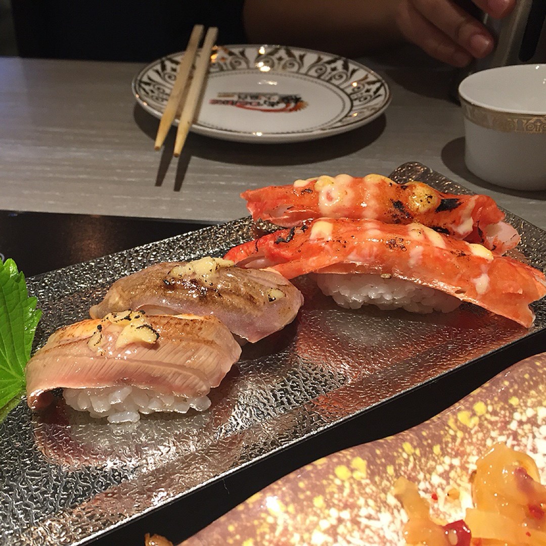 蒜蓉火灸三文魚壽司。火灸蟹棒壽司