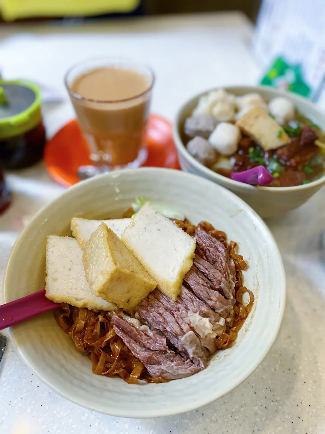 Sliced beef brisket, fish cakes noodle