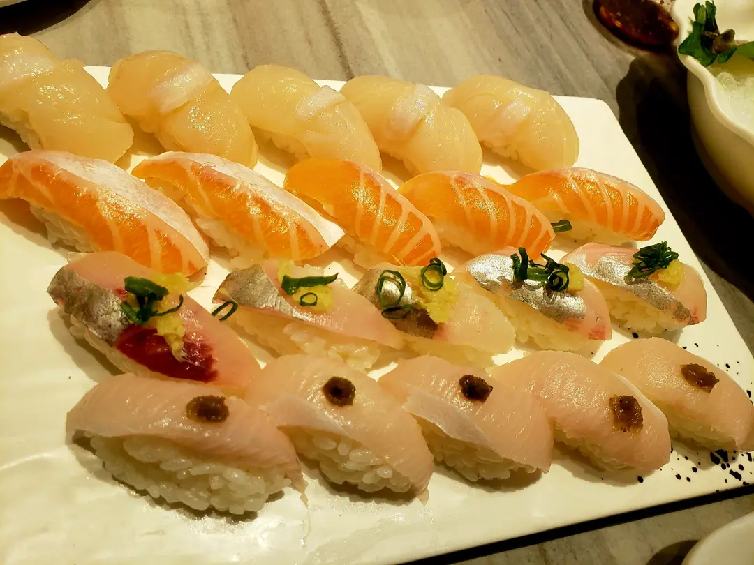 帆立貝、三文魚腩、油甘魚腩、 香葱深海池魚王…壽司