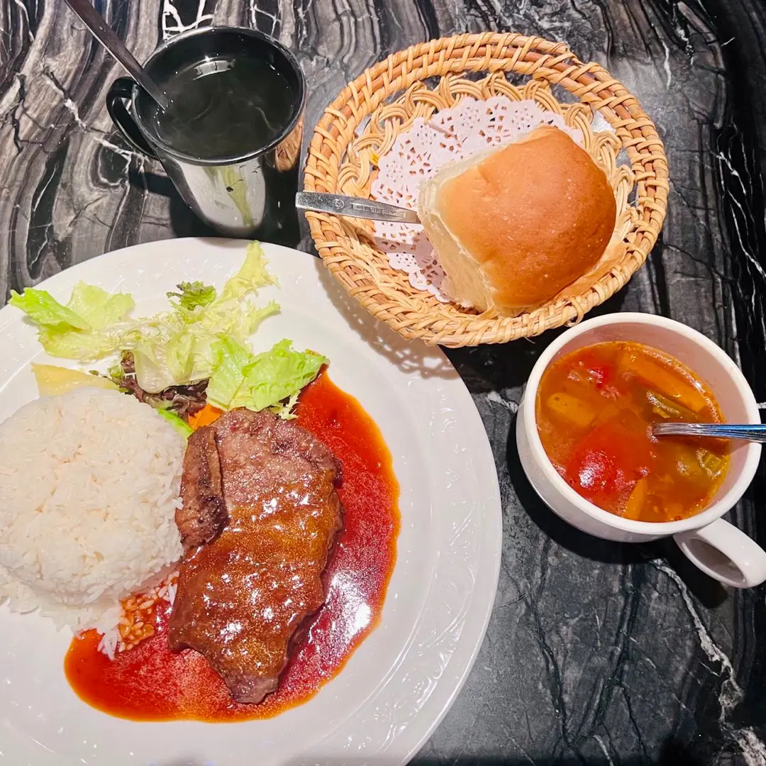 牛肝菌汁西冷牛扒配飯 + 餐湯 + 餐包 + 熱西洋菜蜜