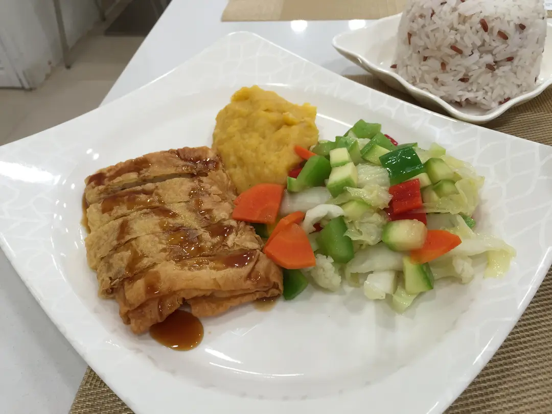 烤鵝片配南瓜蓉、蔬菜
