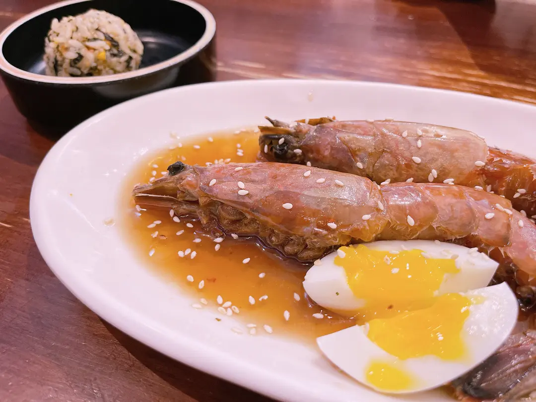 醬油蝦配溏心蛋手握紫菜飯