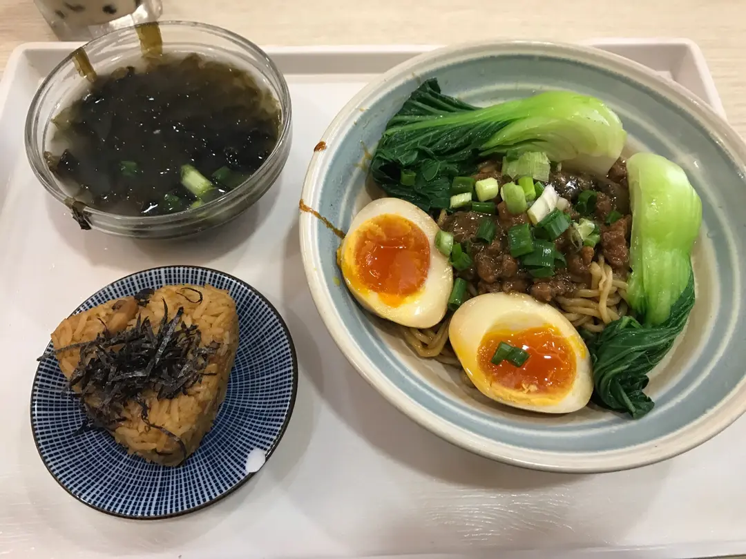 肉燥滷蛋干拌麵配紫菜飯團+海帶湯
